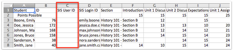 - When you open the CSV file, student IDs will be visible in the “SIS User ID” column.
