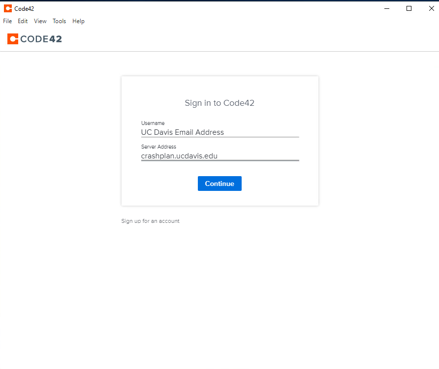 When the CrashPlan application starts, it will ask you to sign in. Once you have provided your UC Davis email and clicked on "Continue" the application will open a browser window for you to complete the login process. Your username and password are your UCD Email Address and Kerberos password.