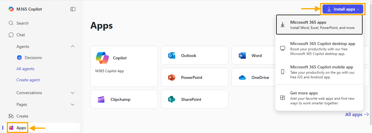 3. On the M365 Copilot menu on the left side of the page, click "Apps". Then click "Install apps" > "Microsoft 365 apps" from the upper-right corner.