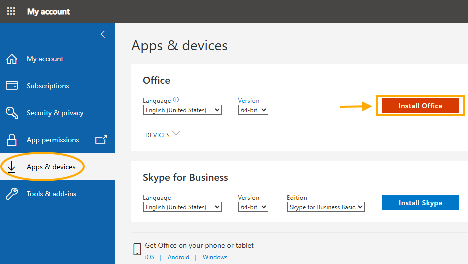 4. On the next page, click "Apps & devices", then verify the Language and version. Click "Install Office" to proceed.