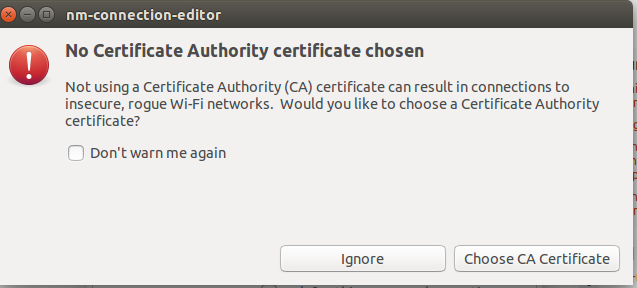 An error that some Linux users have been seeing when trying to connect to eduroam. Often, clicking "Choose CA Certificate" does nothing, and you get stuck in a loop. This appears to be a bug.