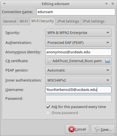 - Anonymous Identity: Leave blank unless you're having trouble connecting. Then, for eduroam try: anonymous@ucdavis.edu or @ucdavis.edu.