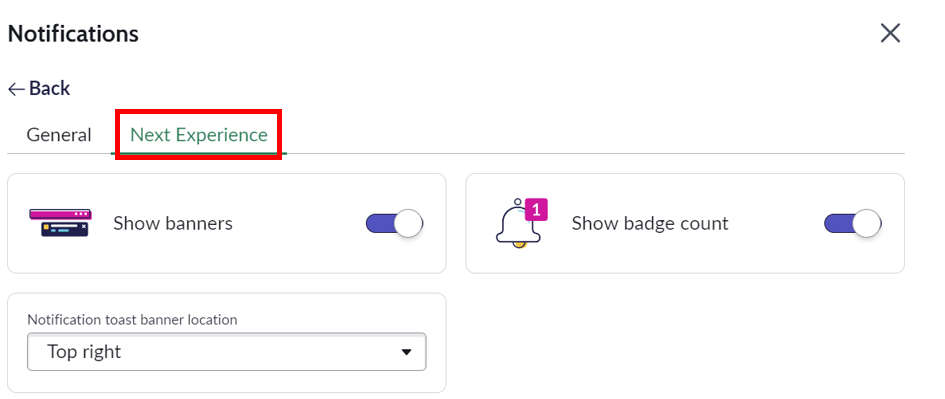 5. Click Next Experience to toggle Show Banners, Show Badge Count, and the Notification toast banner location.