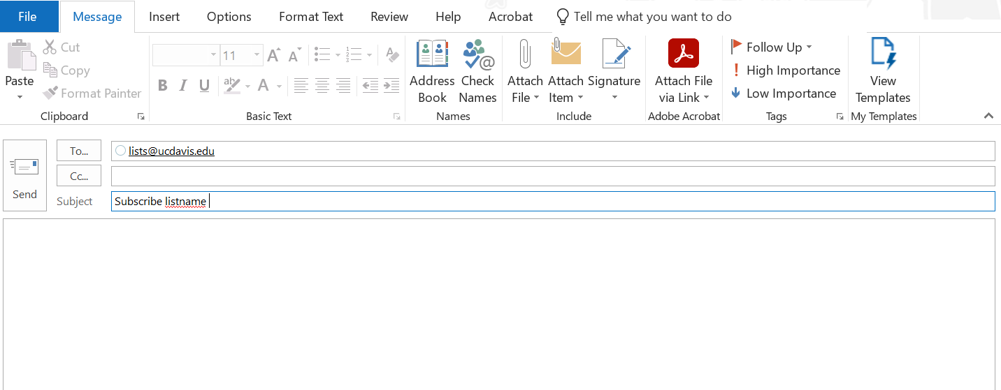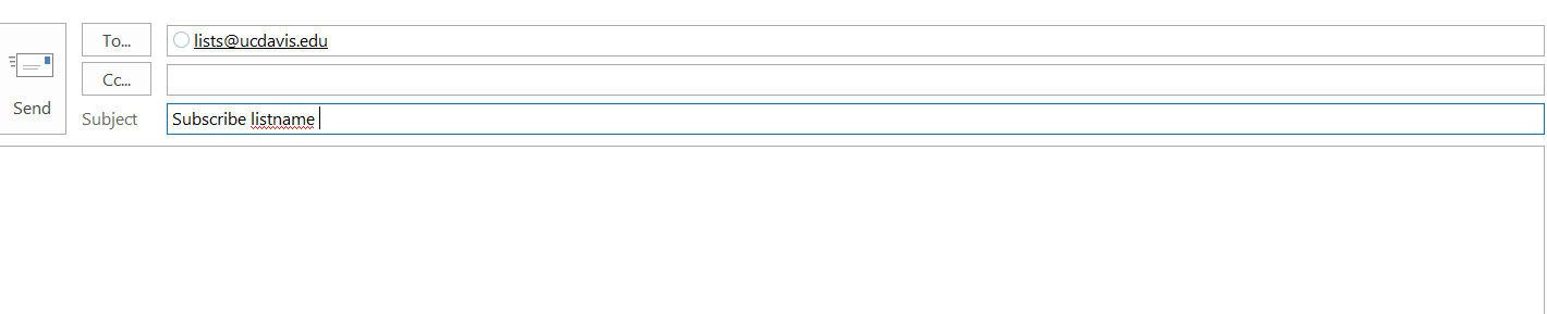 The following actions can be performed by sending an email to lists@ucdavis.edu and enter the appropriate command (Subscribe or Signoff) in the subject line of your email and then the list name (without the @ucdavis.edu) and your name (if subscribing) or email address (if unsubscribing). Make sure that you have removed any signature files from the message.