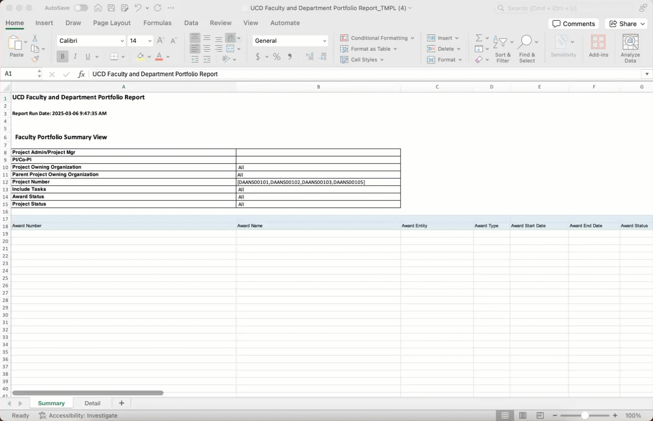 (Optional) Filter for Award Status, Project Status, and Tasks (Include Tasks) using the parameter settings on the UCD Faculty and Department Portfolio Report page.