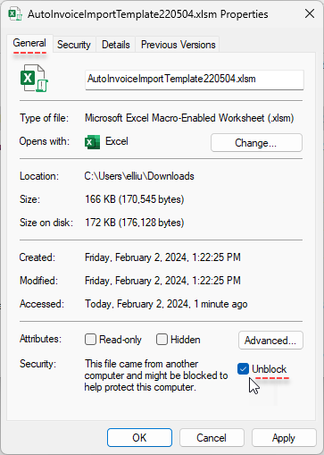 Right-click the AutoInvoiceImportTemplate.xlsm file and choose Properties.
