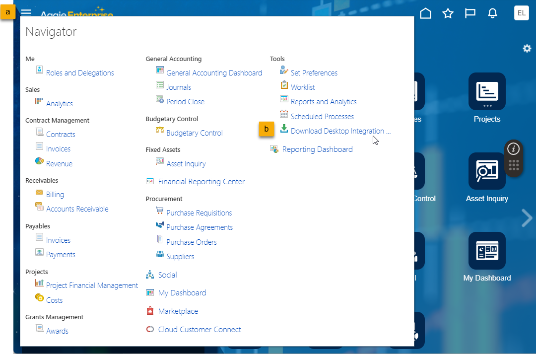 Navigator (a), choose Tools (b) and Download Desktop Integration (c).