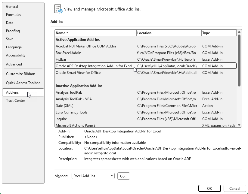 In the dialog box that opens, click Add-ins, and verify that Oracle ADF Desktop Integration Add-In for Excel is in the list.