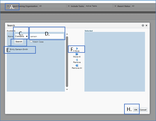 - Use the ▶ button to move it to the “Selected” column. You can select multiple names, if needed.
