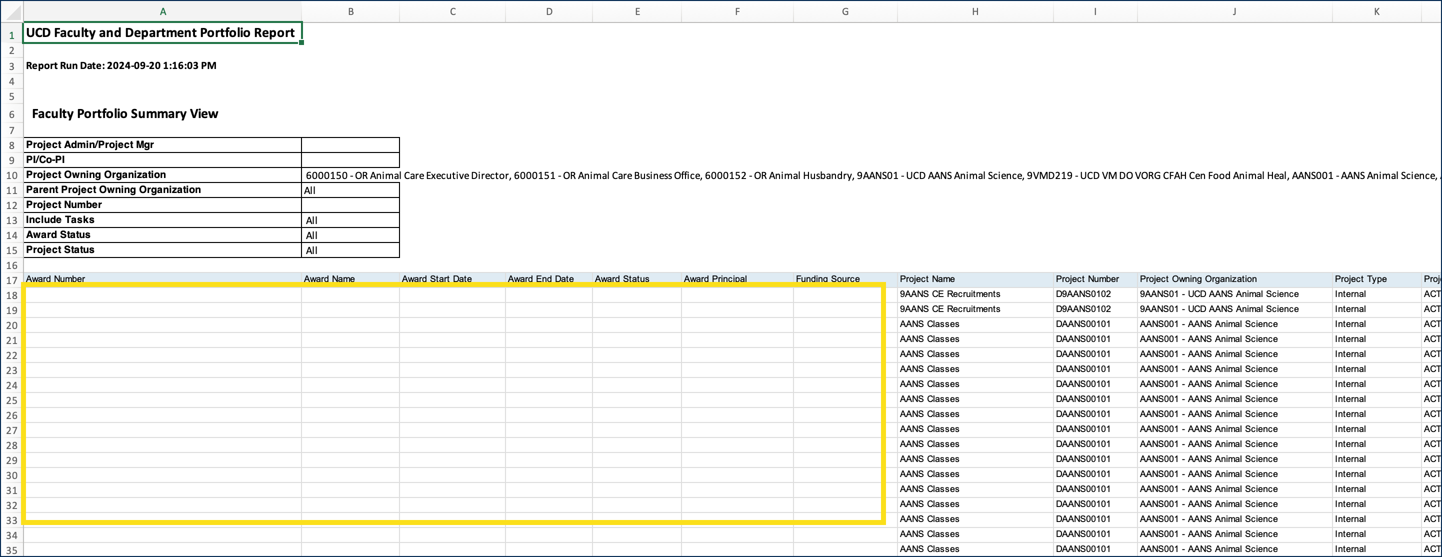 The award and funding source columns on the left of the report will be empty, since there is not an award associated with Internal Projects. See the following two screenshots for examples of how a Faculty and Department Portfolio Report for a non-sponsored project looks like when generated.