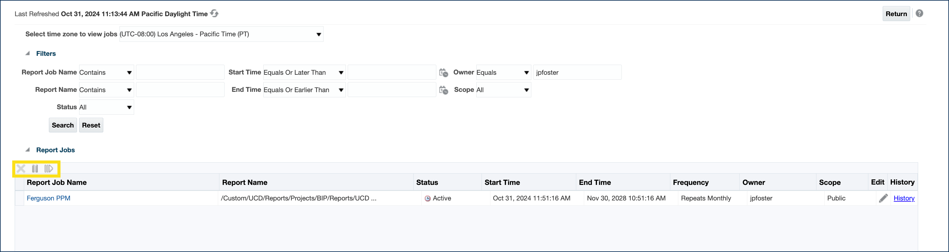 On the Manage Report Jobs page that appears, select the report in the Report Jobs list, and: