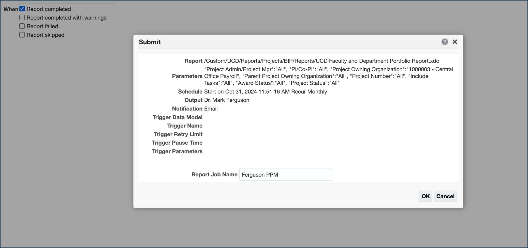 When prompted, enter a Report Job Name. Entering a meaningful job name helps to identify the content and purpose of the report. The report will now automatically run on the frequency that you have set up.