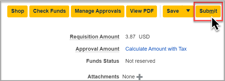 - After reviewing each of the sections and fields described in this procedure, click Submit. The submitted requisition will automatically route to the fiscal approver (PPM Project or Charge Account) and other approvers for specialized commodities. After the Requisition is fully approved, the resulting Purchase Order will automatically transmit to the applicable supplier(s). No manual intervention is required to transmit Purchase Orders to suppliers for catalog orders.