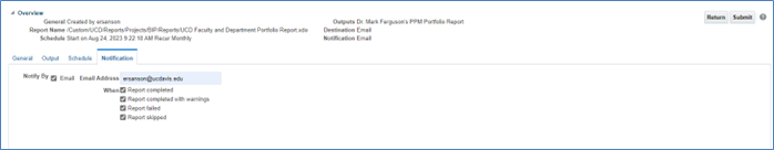 UC Davis employees will use these steps to run and analyze a portfolio-level report showing all PPM activity for an individual Faculty (PI), and individual Project Manager or a project-owning organization (Financial Department). This guide also includes steps for running the report immediately and for scheduling the report to run at regular intervals. Both approaches will result in a formatted Excel file; the report does not produce an HTML output.