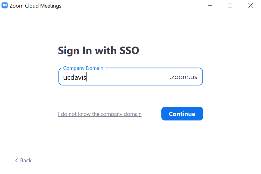 5. Enter "ucdavis" (without quotes) into the Company Domain field then click Continue.