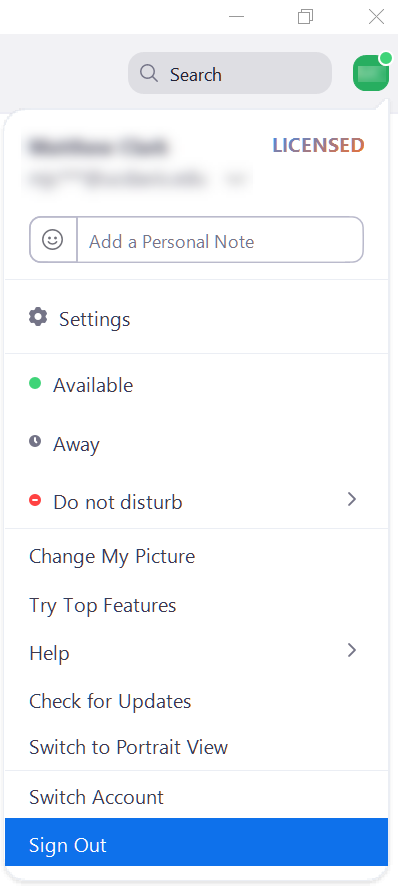 2. If you are already logged in to the app using a non-UC Davis Zoom account, log out by clicking your profile icon (at the top right of the Zoom screen) then selecting Sign out.