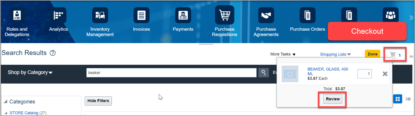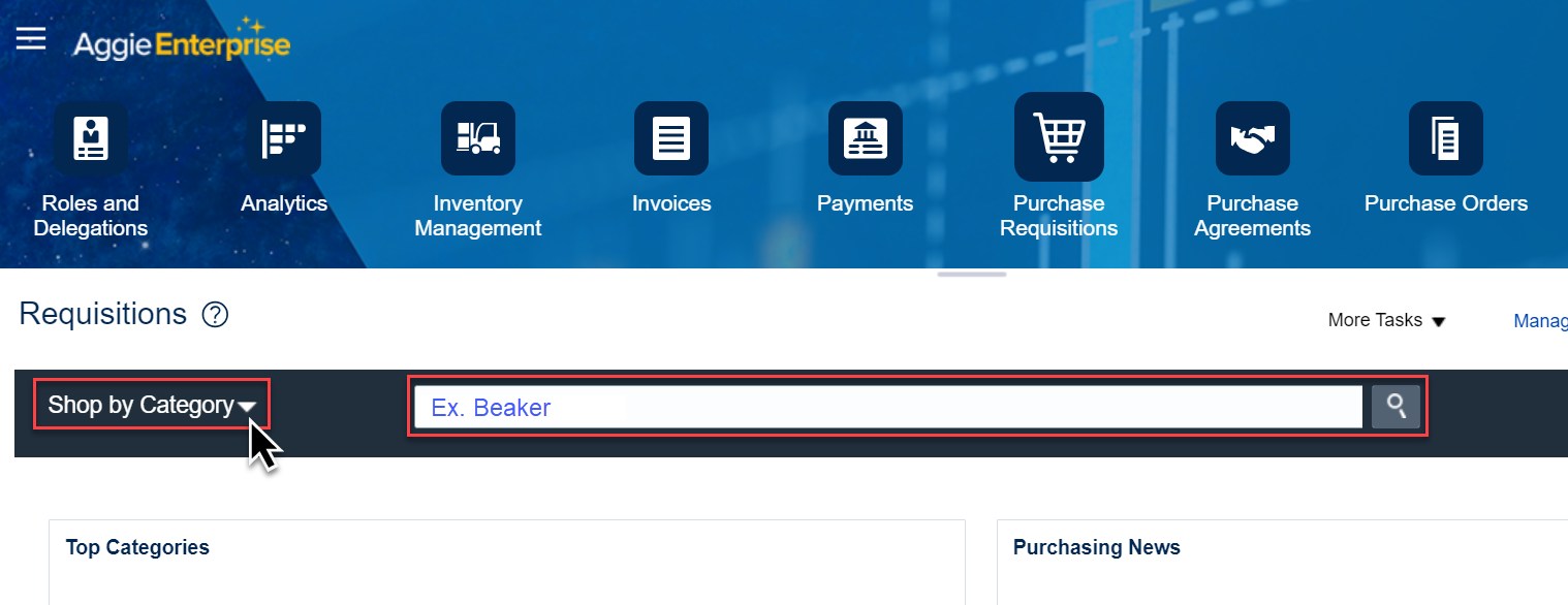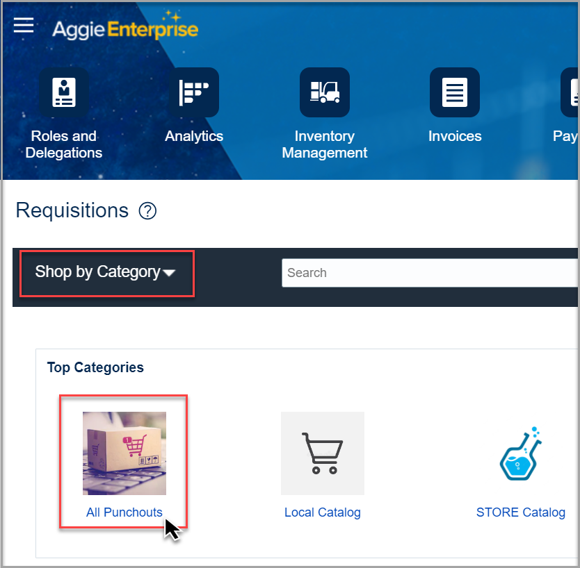 1. On the Requisitions screen, use Shop by Category in the upper-left corner or the Top Categories section, and click All Punchouts