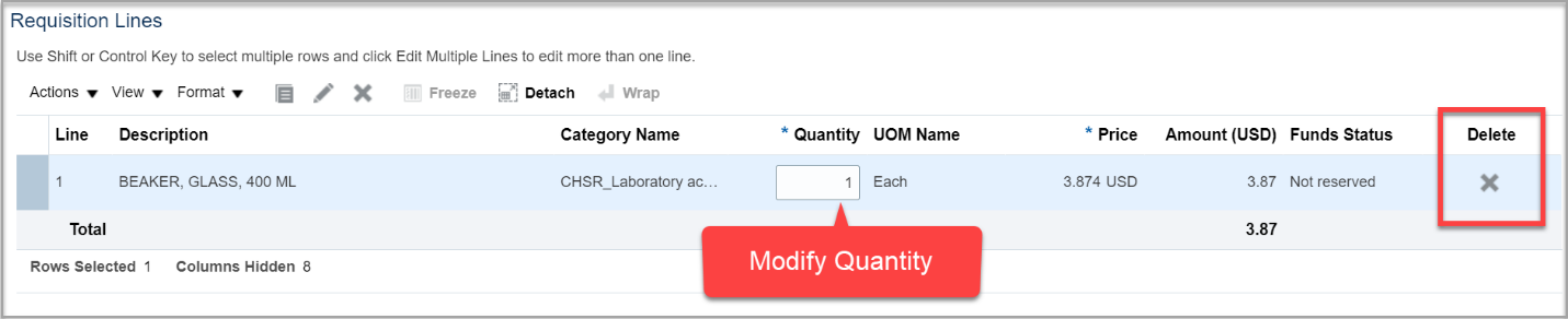 3. Review the Requisition Lines to ensure that the desired items and quantities are in the shopping cart.