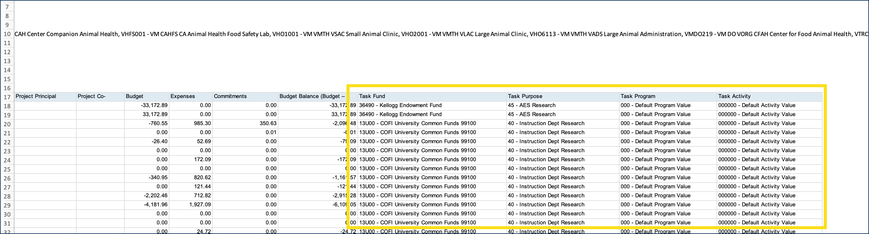 The CoA attributes associated to each task are listed in the last 4 right right-hand columns. This allows the viewer to ensure that CoA values are assigned for each task. A specific value must be selected for Fund and Purpose; default values or specific values are allowed in the Program and Activity fields. If any of these columns are empty, or if Fund or Purpose are assigned the default values, go to the “Adding and Managing Tasks for PPM Non-Sponsored Projects” step-by-step guide to make corrections.