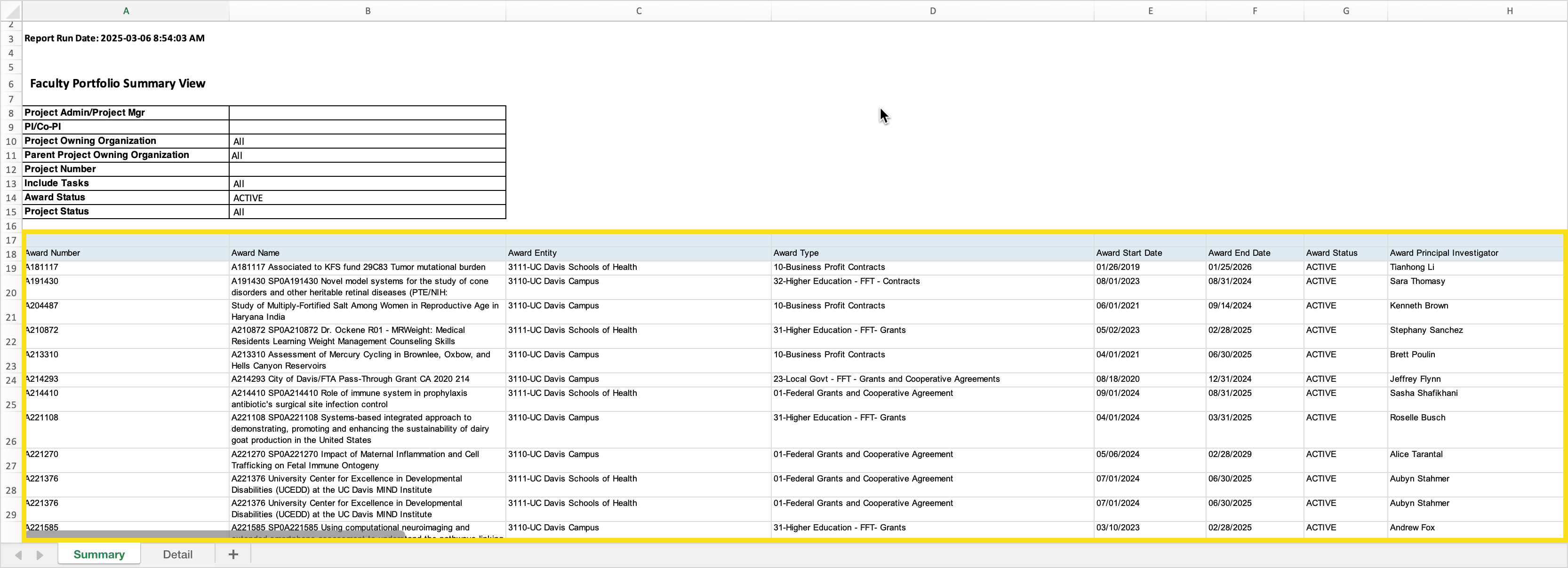 • The award and funding source columns on the left of the report will be empty, since there is not an award associated with Internal Projects. See the following two screenshots for examples of how a Faculty and Department Portfolio Report for a non-sponsored project looks like when generated.