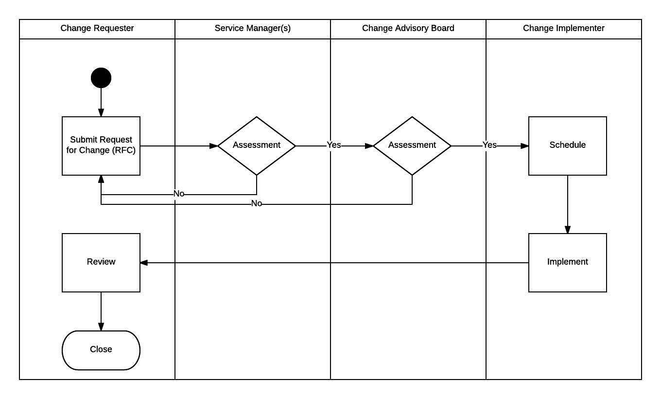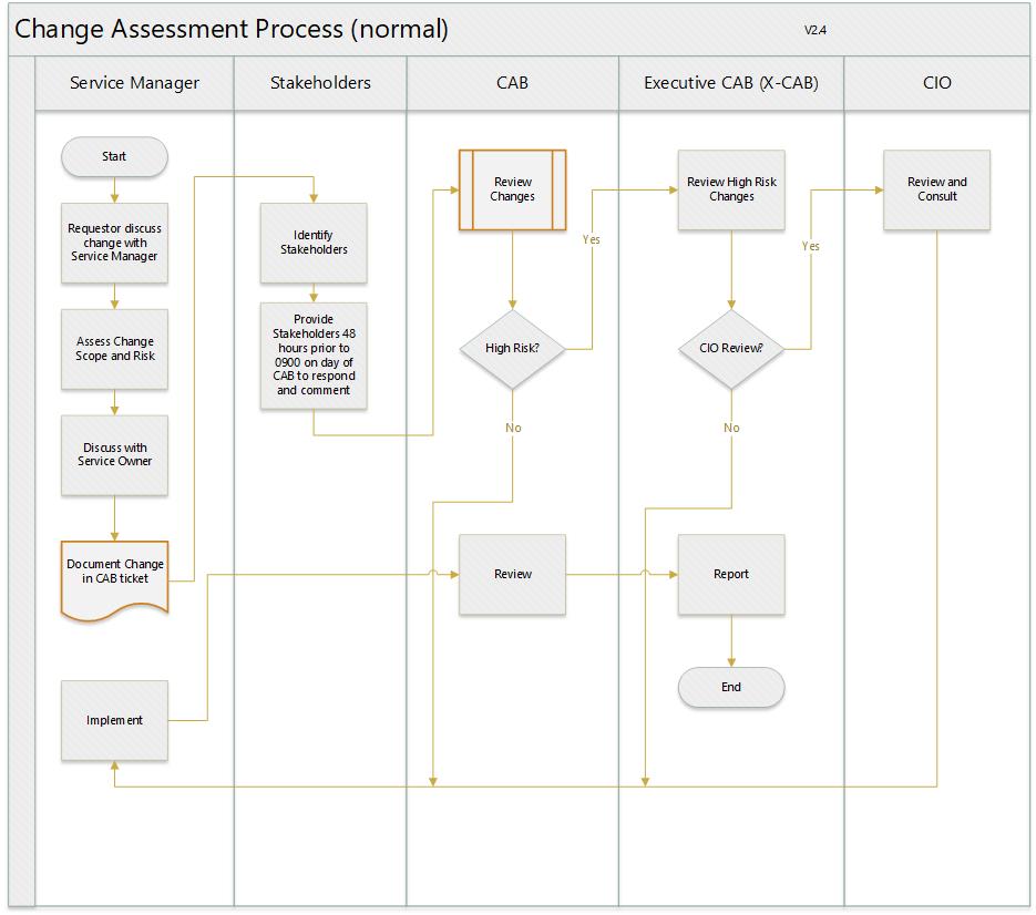 The Service Manager is responsible for driving the change forward. The Service Manager needs to ensure that the Service Owner and all stakeholders have been consulted before taking the change forward to the CAB for approval. The change initiator gets initial approval for the change after consulting the Service Manager. This starts the process. When the change has been approved by the Service Manager and Service Owner, the change initiator needs to submit the CAB ticket for approval.