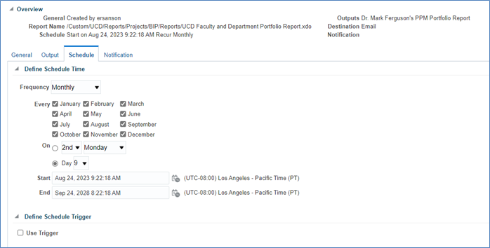 UC Davis employees will use these steps to run and analyze a portfolio-level report showing all PPM activity for an individual Faculty (PI), and individual Project Manager or a project-owning organization (Financial Department). This guide also includes steps for running the report immediately and for scheduling the report to run at regular intervals. Both approaches will result in a formatted Excel file; the report does not produce an HTML output.