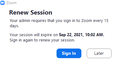 NOTE: You will be prompted to sign in to Zoom every 15 days. Remember to select the "Sign In with SSO" option when renewing your session.