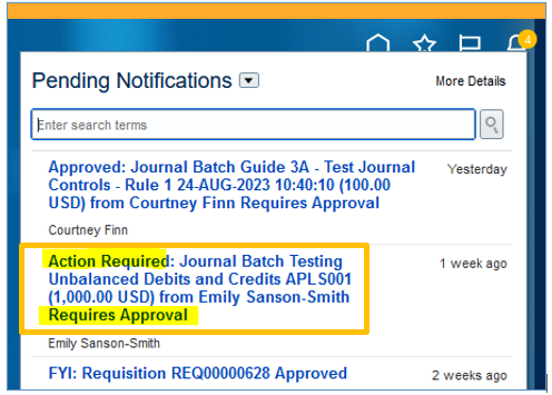 - Click on the bell icon located at the upper right-hand corner of the home page for journal approval request notifications.