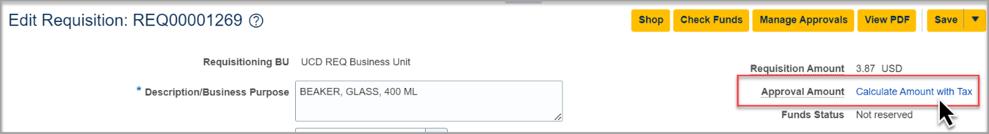 Taxes are calculated automatically by Aggie Enterprise, based on the types of commodities and services being purchased, as well as the delivery location.  Some commodities are nontaxable and, in those cases, taxes will not be calculated by Aggie Enterprise.  To view the taxes calculated on the Requisition, click on Calculate Amount with Tax in the upper right header to see the total taxes for the Requisition.   Although the calculation for the Requisition is at the total header level, the resulting Purchase Order will display the taxes at the individual line item level.