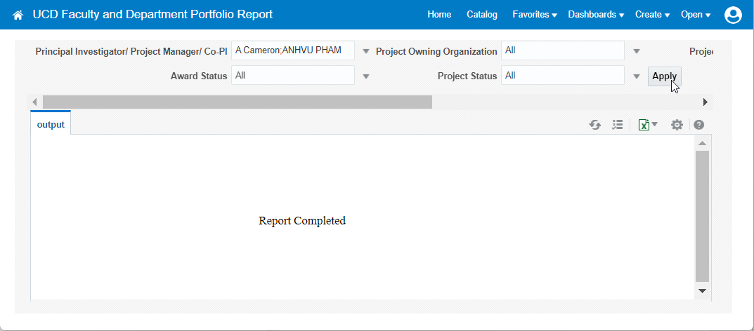 (Optional) Filter for Award Status, Project Status, and Tasks (Include Tasks) using the parameter settings on the UCD Faculty and Department Portfolio Report page.