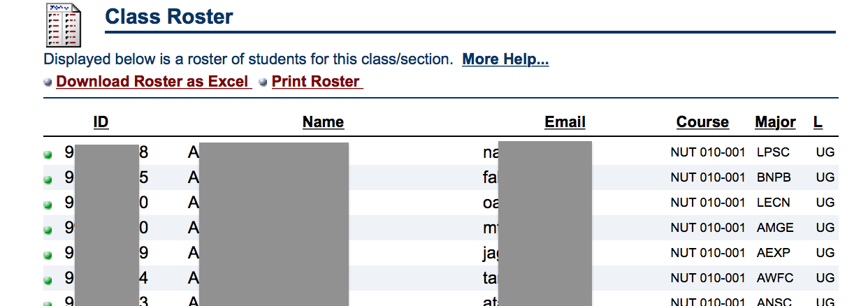 The roster that appears will be similar to what appears below.  At this point, you have the option to print or download the roster as an Excel file.