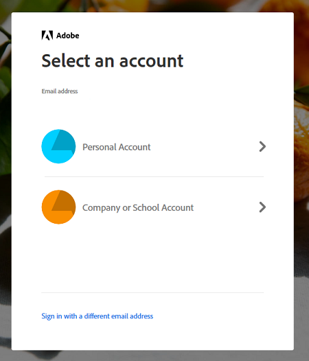 - On the next screen, select Company or School Account . You will only see the Adobe ID personal account if you have used your UC Davis email address to sign-up for an Adobe ID at some point. For this process, make sure to select the Company or School Account .