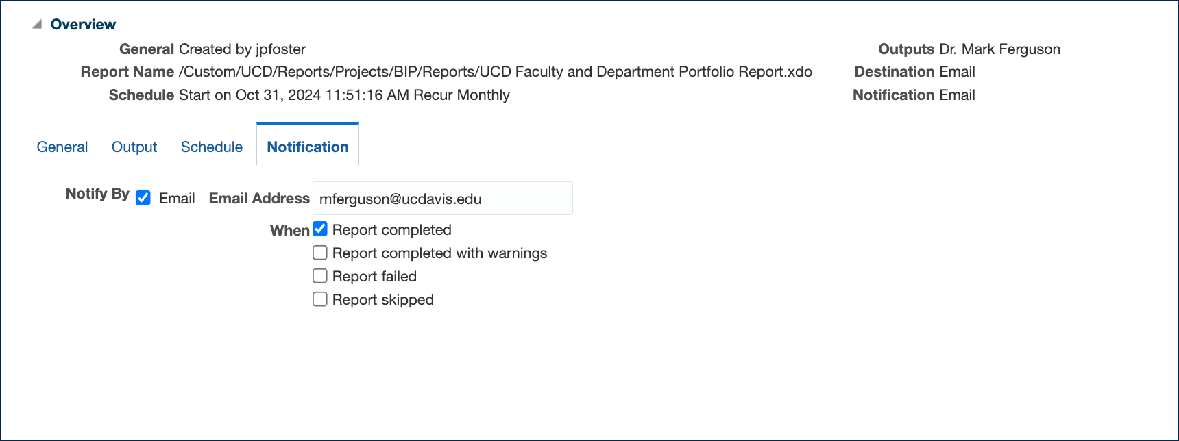 5. On the Notification tab, if you want to be notified each time the report is run, enter your Email Address and select When you want to be notified.