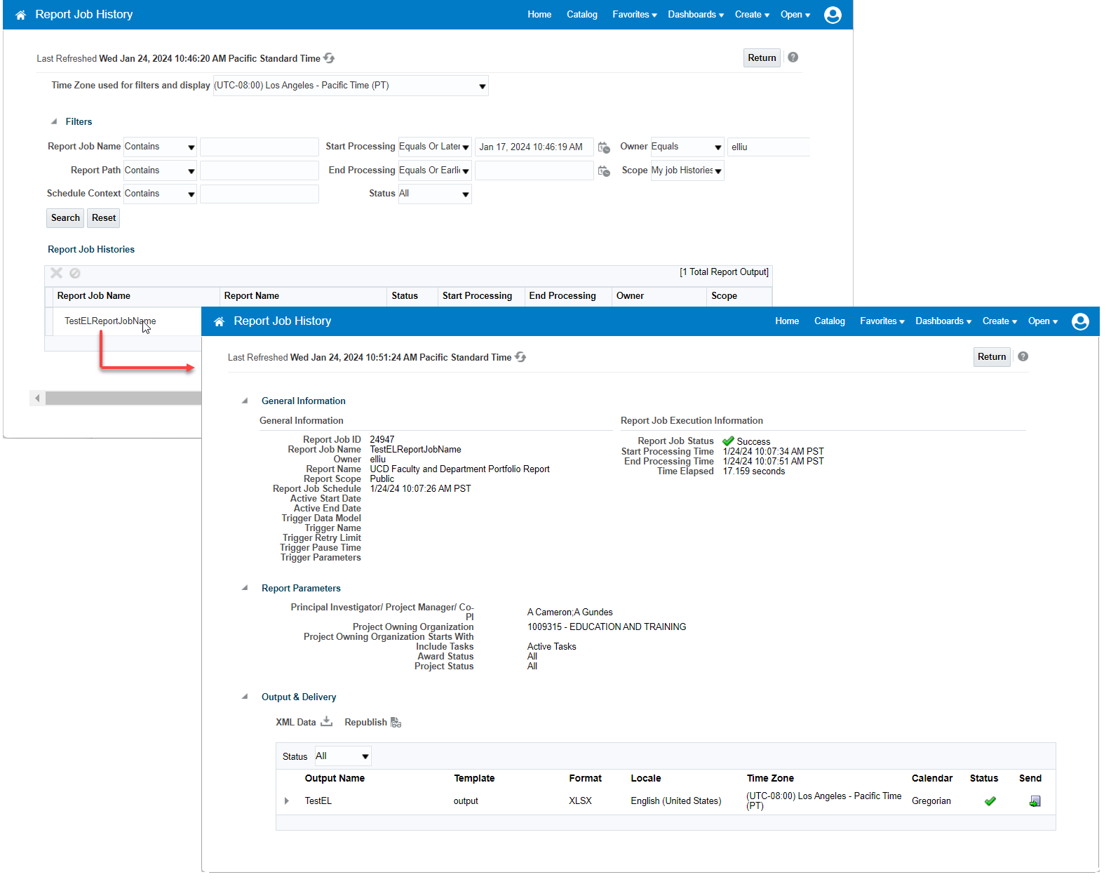 3. Review the report job information. To view (download) the report that was generated by the job, click the name in the Output Name column.