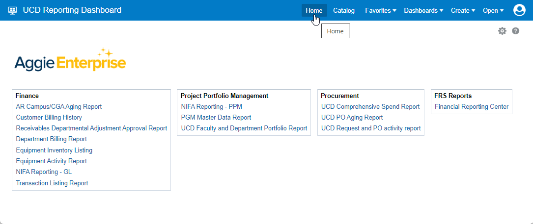 1. On the UCD Faculty and Department Portfolio Report page, click Home.