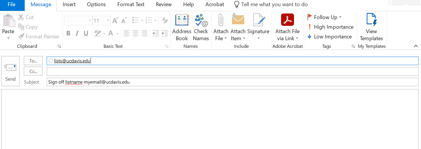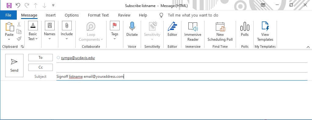 The following actions can be performed by sending an email to sympa@ucdavis.edu and enter the appropriate command (Subscribe or Signoff) in the subject line of your email and then the list name (without the @ucdavis.edu) and your name (if subscribing) or email address (if unsubscribing). Make sure that you have removed any signature files from the message.